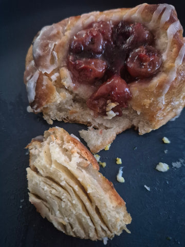 Cherry Danish Ingredients: rice flour, milk, tapioca flour, brown rice flour, sweet rice flour, whey (dairy) protein isolate, powdered sugar (sugar, corn starch), eggs, canola oil, sugar, Butter (pasteurized cream, salt), cream cheese (pasteurized cultured milk and cream, salt, xanthan gum), cherries, pectin, baking powder (corn starch, sodium bicarbonate, sodium aluminum sulfate, monocalcium phosphate), xanthan gum, natural vanilla flavoring, yeast, salt. May contain food coloring. Prepared on common smallwares with items containing peanuts, tree nuts, eggs, milk & soy.